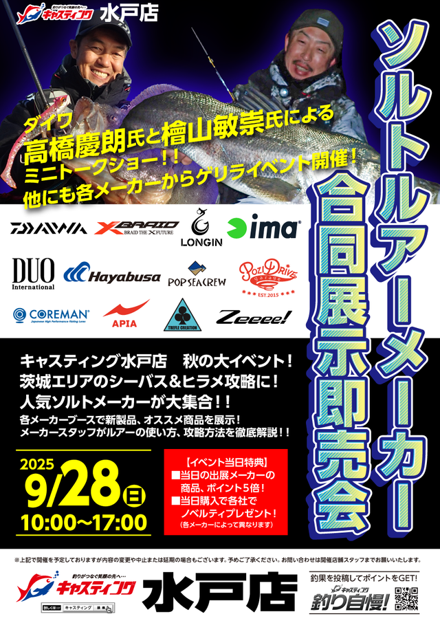 9月28日(日)はキャスティング水戸店様にて、ソルトウォーター合同展示会に参加いたします。 ポジドラブースではイベント限定カラーのルアーやアパレルの販売を行いますので、ぜひご来場下さい!!